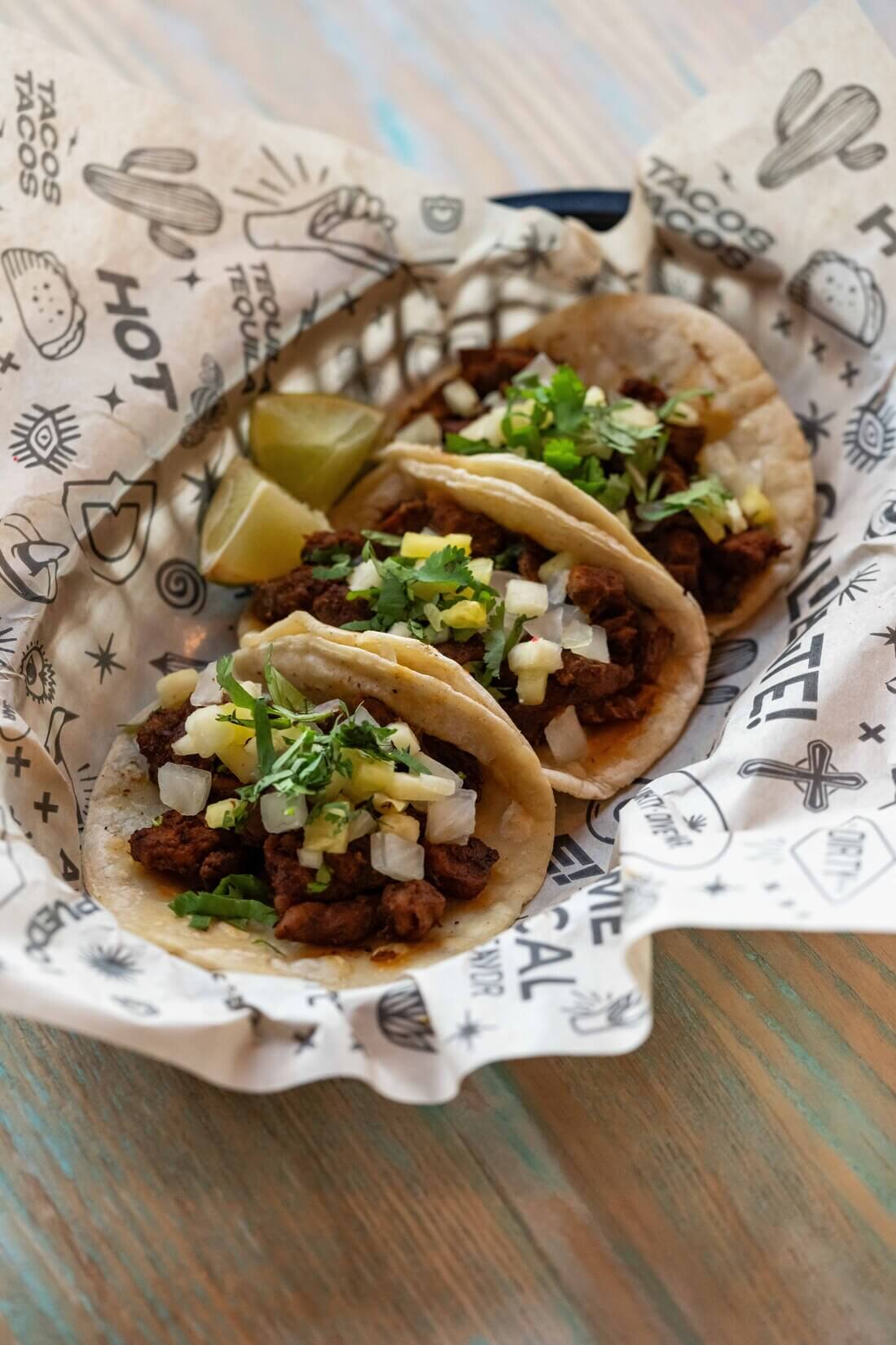 A sweet-savory mix of pork and pineapple, proudly in a tortilla Ingredients: Marinated Pork, Red Salsa, Onion, Pineapple x3 tacos