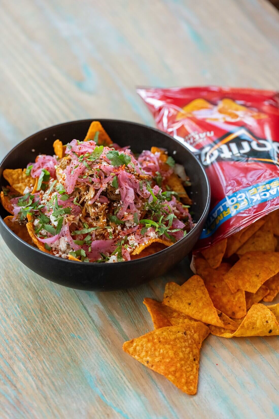 Ingrédients: Doritos, Maïs, Cotija, Oignons marinés, Coriandre, Pico de Gallo, Crème sure, Mayo Chipotle
